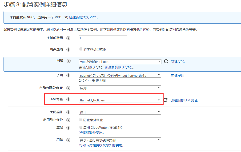 启动实例时需注意添加相应的IAM角色,以及对应的网络关系